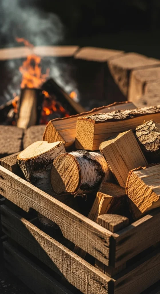 Use a wooden crate, pallet box, or metal basket. Stack wood evenly to allow airflow. A budget idea is using an old shelving unit laid on its side. Keep the crate close enough for convenience but far enough for safety. Cover it during snow or rain.