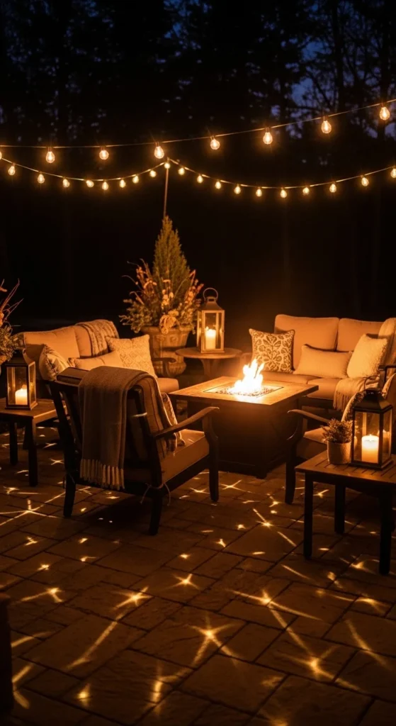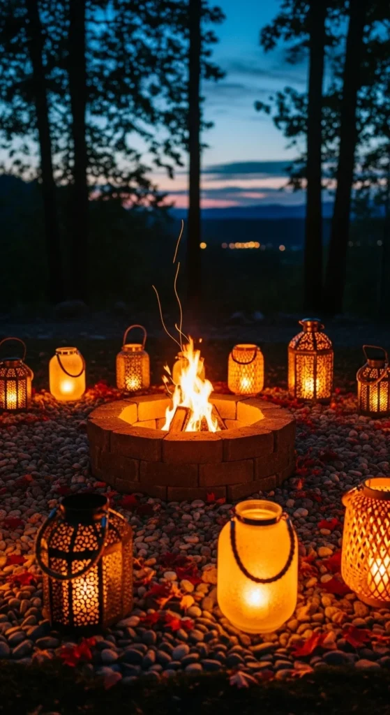 Lantern clusters add gentle side-lighting without competing with the fire.