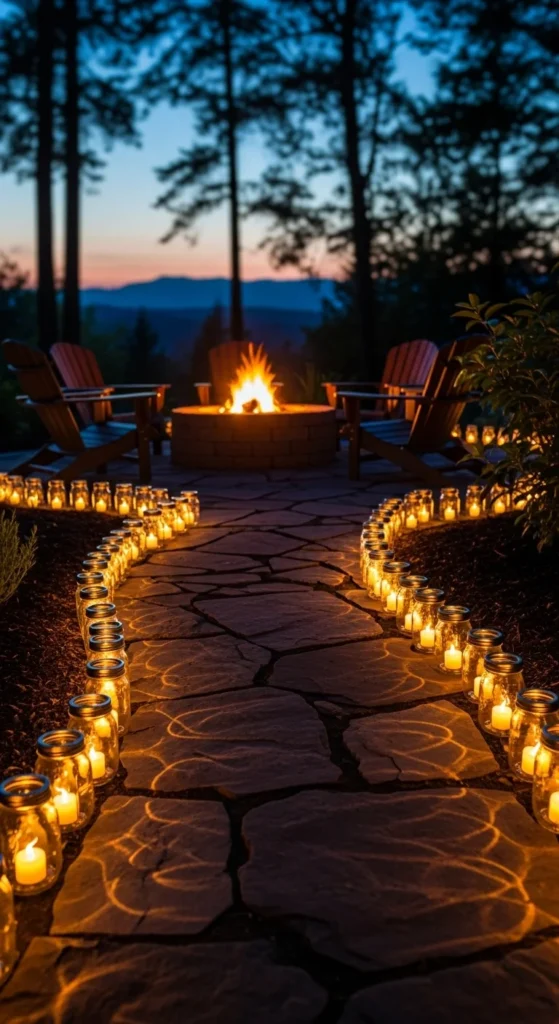 Mason jars add soft guiding light leading toward the fire zone.