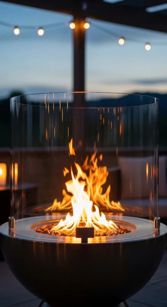 Use clear tempered glass panels arranged in a square or circle around the pit. A DIY option is acrylic sheets attached with metal brackets. Keep the panels high enough to block wind but low enough for heat to reach you.