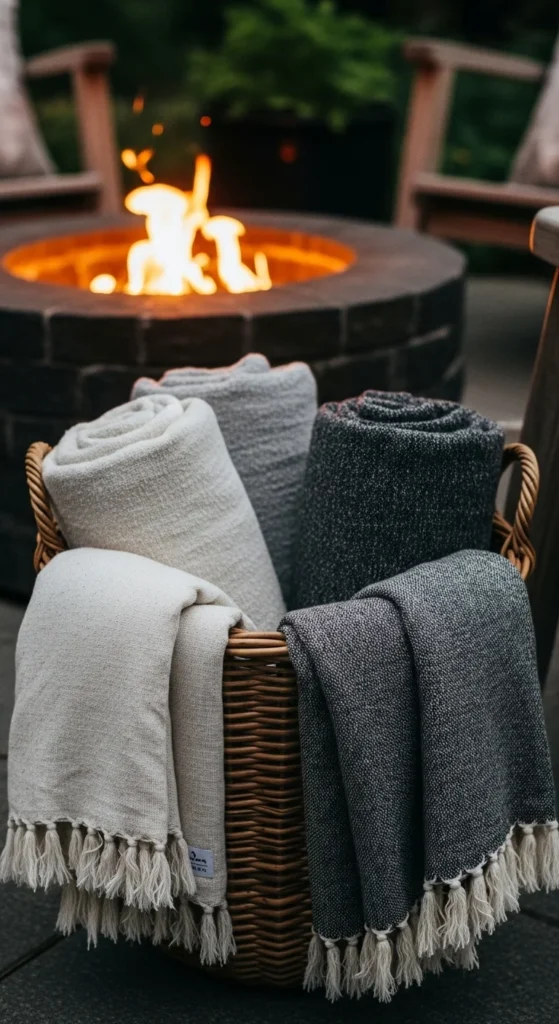 Use a simple woven basket and fill it with outdoor-safe blankets. A low-cost method is buying fleece throws from discount stores. Keep the basket close to chairs for quick access.