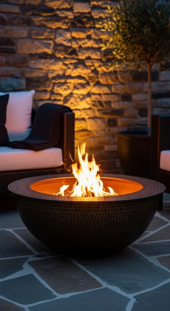 A metal fire bowl offers flexibility. You can move it across the patio depending on the weather or seating layout.