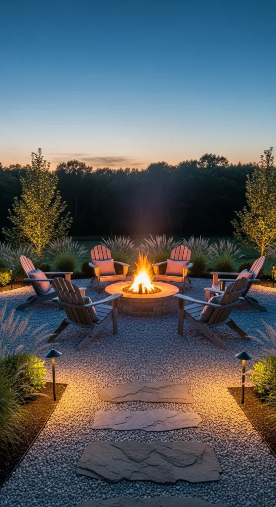 Mark the area and pour a layer of compacted gravel. Add a ring of large stones around your fire pit. Use simple wooden benches or outdoor chairs. A budget idea is repainting old chairs instead of buying new ones. Clean stray gravel from pathways to keep the patio tidy.