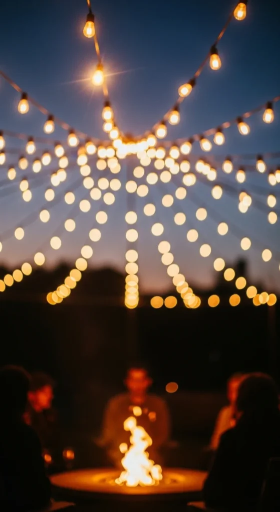 Stretch lights between poles or trees. Keep them high enough for easy movement. A budget trick is using shepherd hooks instead of tall poles. Choose warm-toned bulbs so the firelight and overhead lighting blend well. Replace weak bulbs as needed.