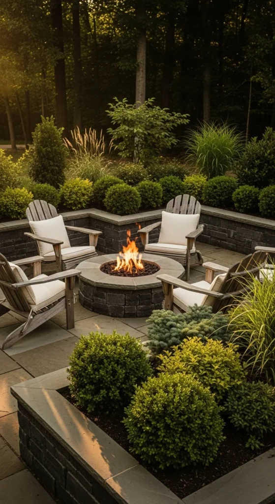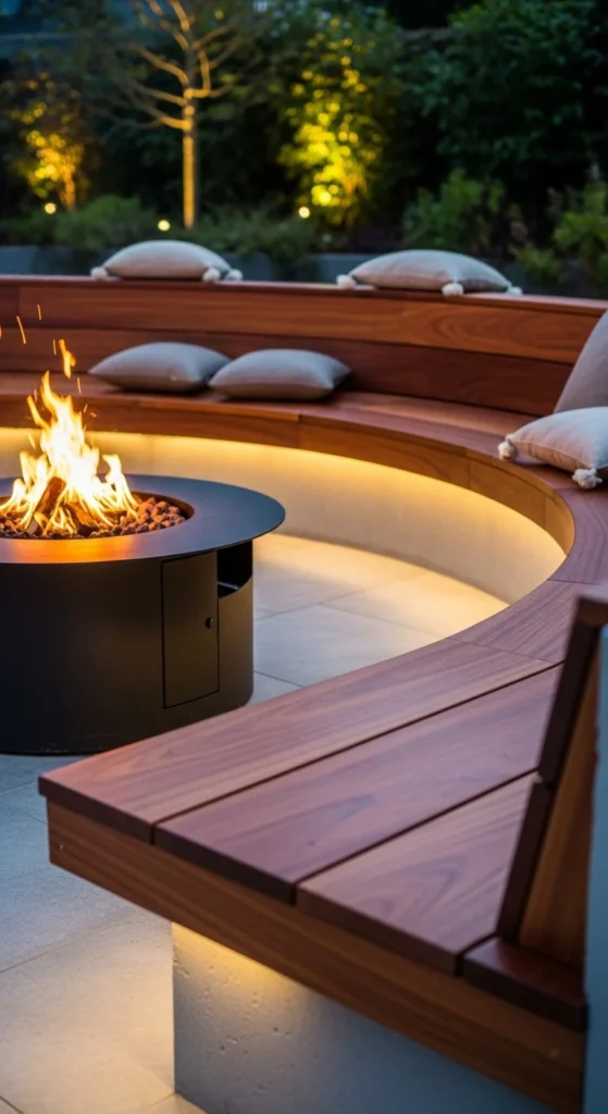 Built-in benches make seating easy and neat. They frame the fire pit and keep the layout consistent.