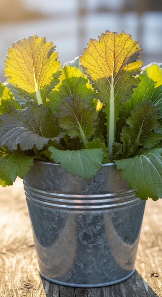 Mustard greens handle cold surprisingly well. Buckets provide enough depth for strong roots. Sow seeds generously and thin as needed. The leaves grow fast, and you can harvest outer leaves continuously. Water lightly and keep the bucket in a bright spot. If wind becomes strong, tuck the bucket behind a patio chair or wall. These greens bring peppery flavor that lifts simple salads instantly.