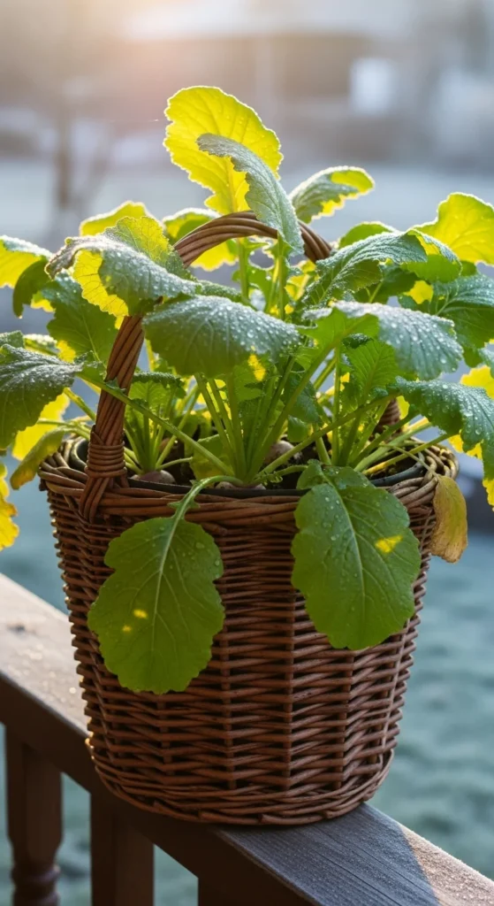 Turnip greens deliver generous yields in winter. A basket planter lets roots breathe well. Sow seeds thickly and thin to your liking. Trim young leaves for salads and let the plant continue producing. Add a handful of compost every few weeks to keep growth steady. This container fits easily on small patios and porches.