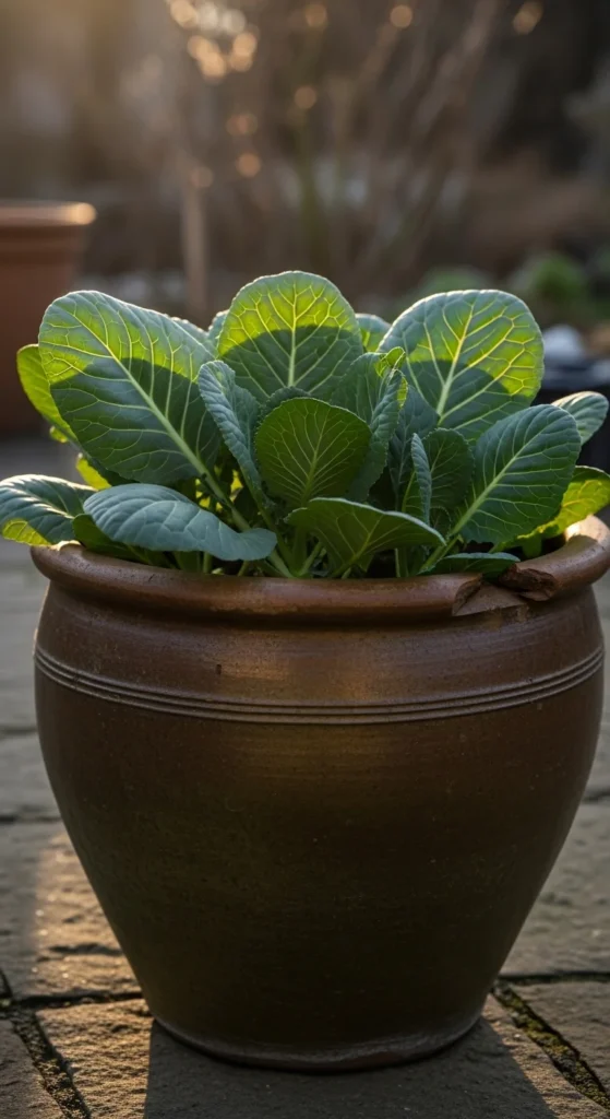 Collards grow well in cooler weather. A heavy clay pot anchors the plant against winter winds. Plant just a few seeds per pot and thin later. Harvest the youngest leaves for salads. Place the pot in a sunny corner where it can absorb daytime warmth. Clay pots help regulate moisture, keeping growth healthy. Add a thin mulch layer for root comfort.