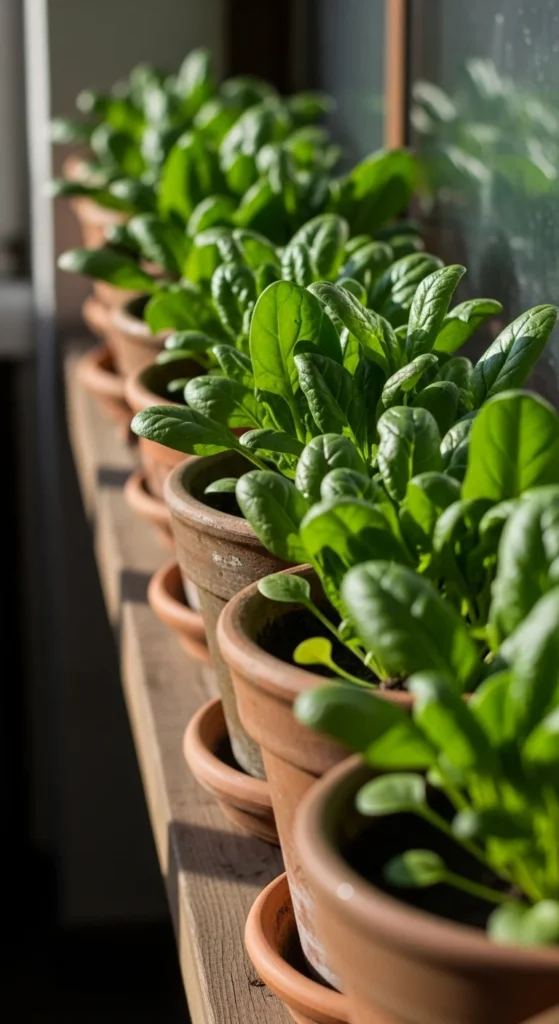 Spinach grows quickly when pots are grouped together. The close spacing helps trap warmth around the leaves. Use medium pots so roots have room to stretch but soil stays warm. Sow thickly and thin out seedlings later. Keep the soil moist but not soggy. Harvest outer leaves regularly to encourage new growth. If frost arrives, move the pots under a patio table or next to a wall for added shelter. You can also drape a thin plastic sheet over the row of pots on colder nights. This setup creates a steady pace of fresh salads without heavy work.