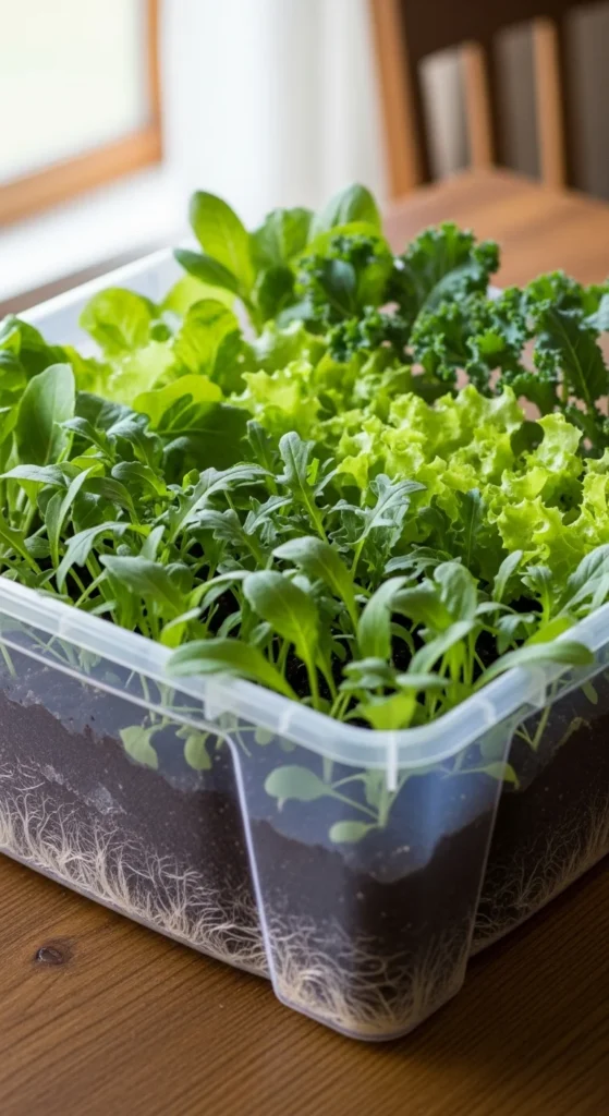 A clear storage bin can double as both container and cover. Fill the bottom with soil, plant your greens, and place the lid loosely on top. The bin traps heat while protecting plants from wind. Open the lid slightly on warm days. This compact garden works well indoors or outdoors. It requires little attention while producing steady greens.