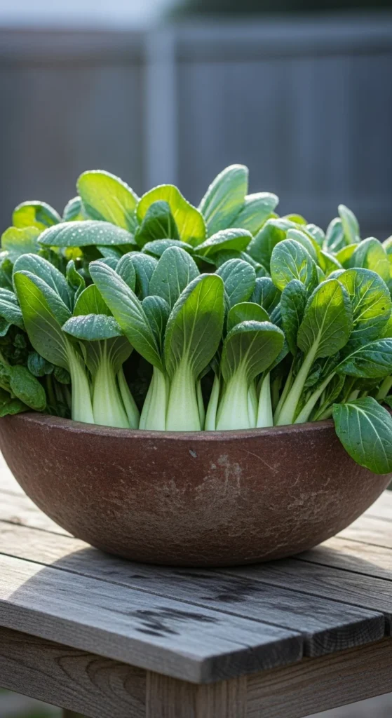 Bowl containers are perfect for fast-growing Asian greens like pak choi, tatsoi, and mizuna. Sow a mix to get variety in every harvest. The wide shape keeps soil evenly warm. Cut the greens a few inches above the soil and let them regrow. Add water when the surface starts to dry. Cover the bowl at night with a plastic dome if temperatures drop sharply. This blend creates lively salads in just a few weeks.