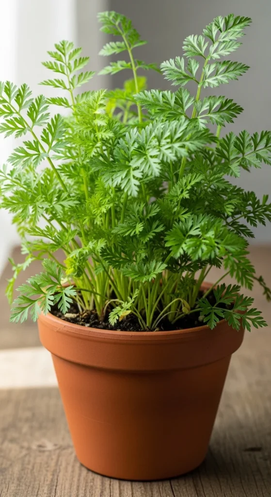 Carrot tops produce tender leaves perfect for salad mixes. Use a medium-height pot with loose soil. Sow seeds thinly and let the tops grow without worrying about large roots. Trim the leaves lightly and often, encouraging steady regrowth. Place the pot where it gets strong daytime light. Water with a gentle hand to avoid compacting soil. This container idea gives you a continuous supply of herb-like greens without heavy gardening.