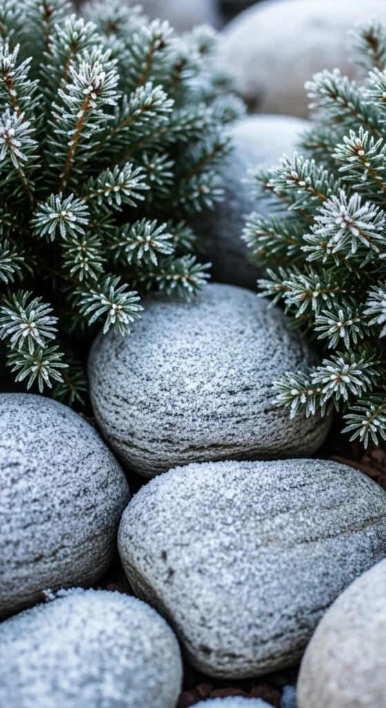 Use soft greys and evergreen foliage to create a calm foundation in your winter garden. Stick to materials that naturally carry these tones. Think grey gravel, weathered pavers, or concrete planters. These blend smoothly with evergreen plants like junipers, boxwood, or small pines.