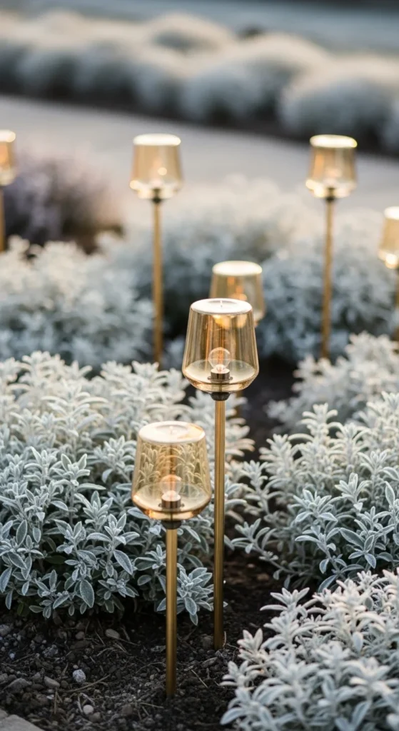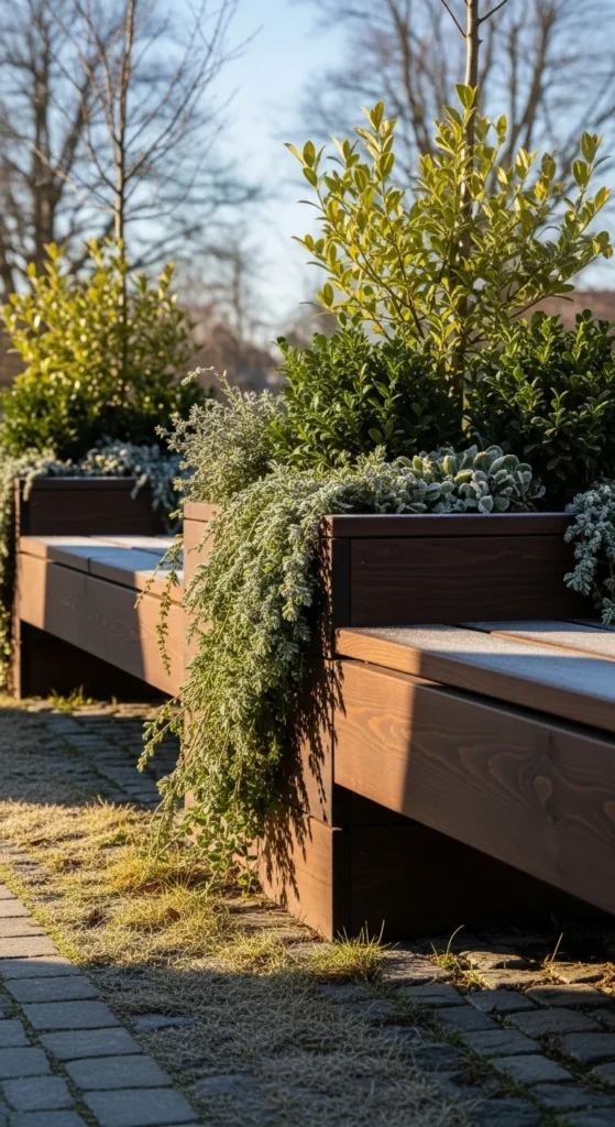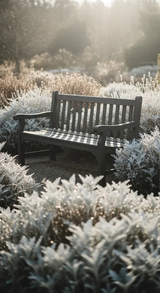 Charcoal tones paired with silvery plants always look sharp in winter. Add a charcoal bench, painted fence panel, or metal planter. Then use silver foliages like artemisia or lamb’s ear.