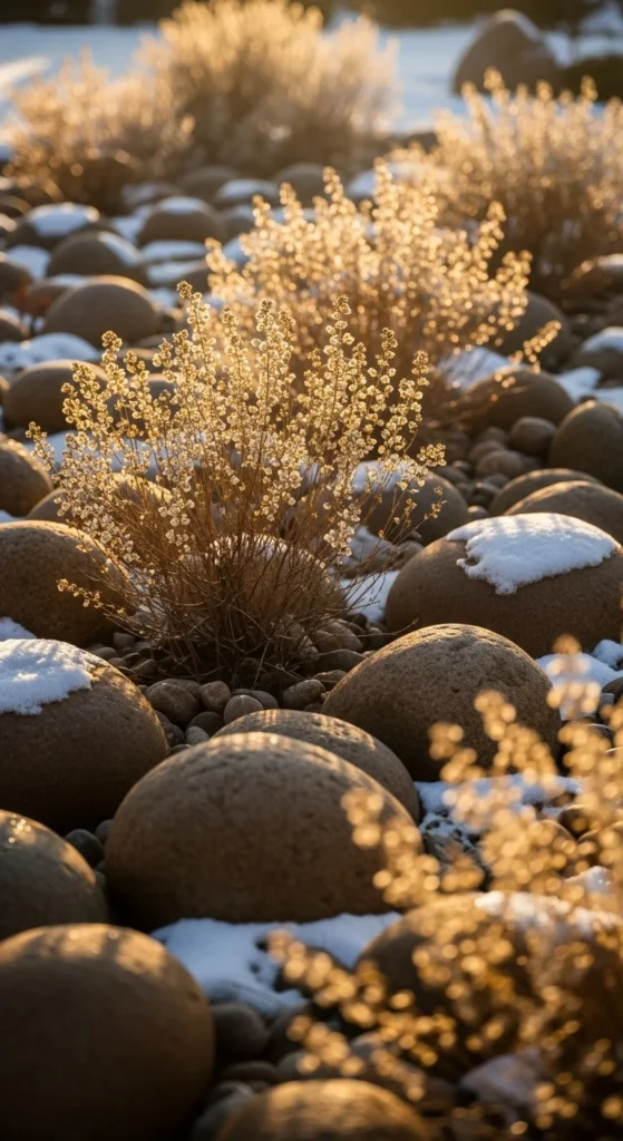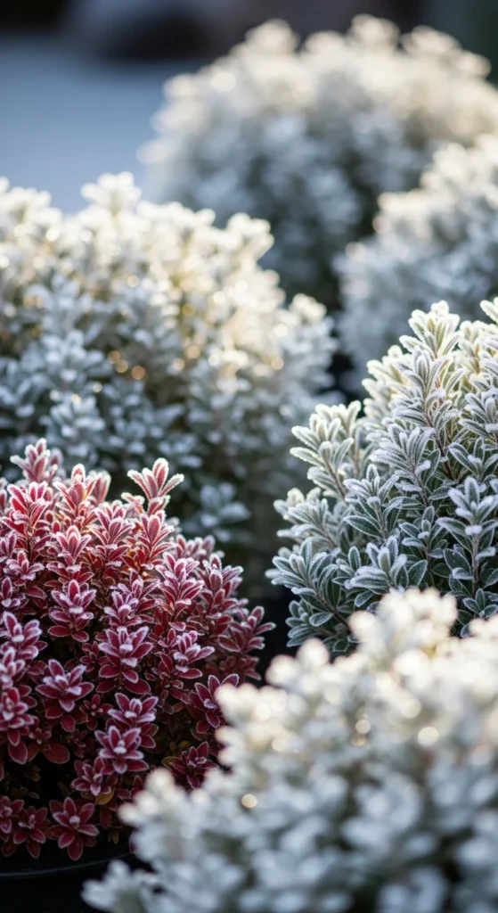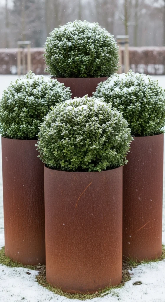 Bronze paired with frosty whites adds character in winter. Use bronze-tone planters or garden ornaments.