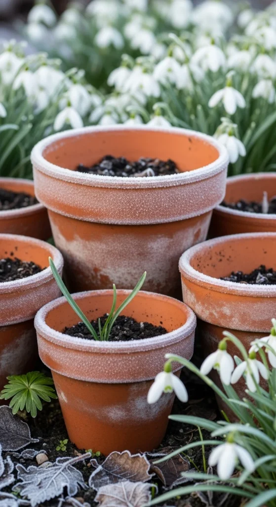 Clean and seal pots to prevent cracking. Add straw mulch for warmth and texture.