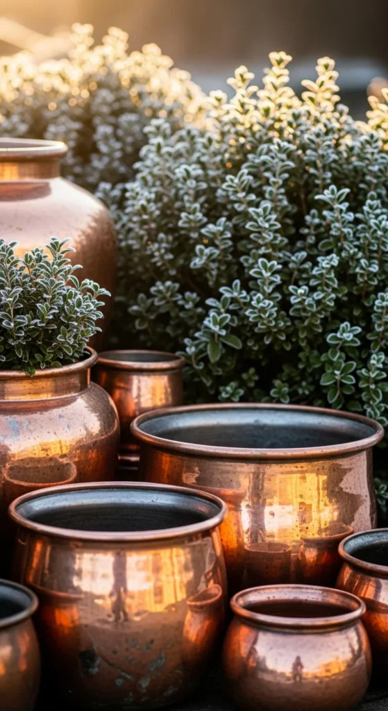 Place them near shrubs like cedar or holly. Their dark colouring balances the shine of copper. Add small LED candles inside the pots for evening softness.