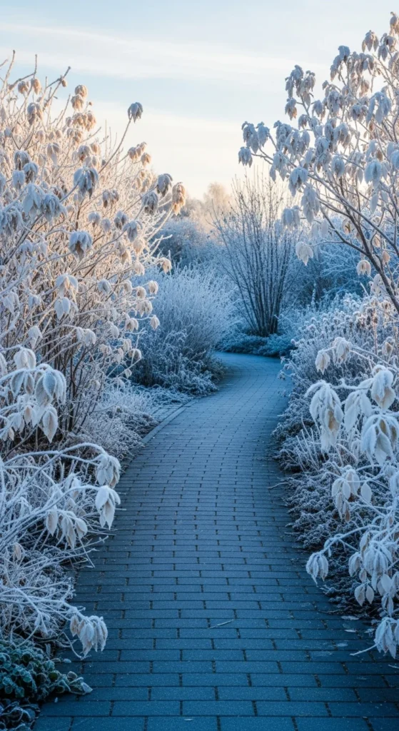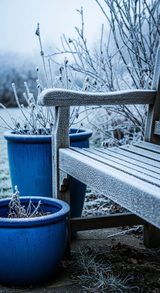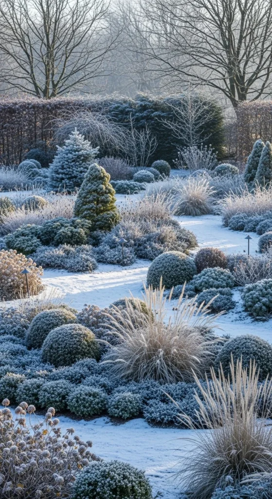 The contrast works especially well in frost, making the space feel polished even when everything else is resting for winter.