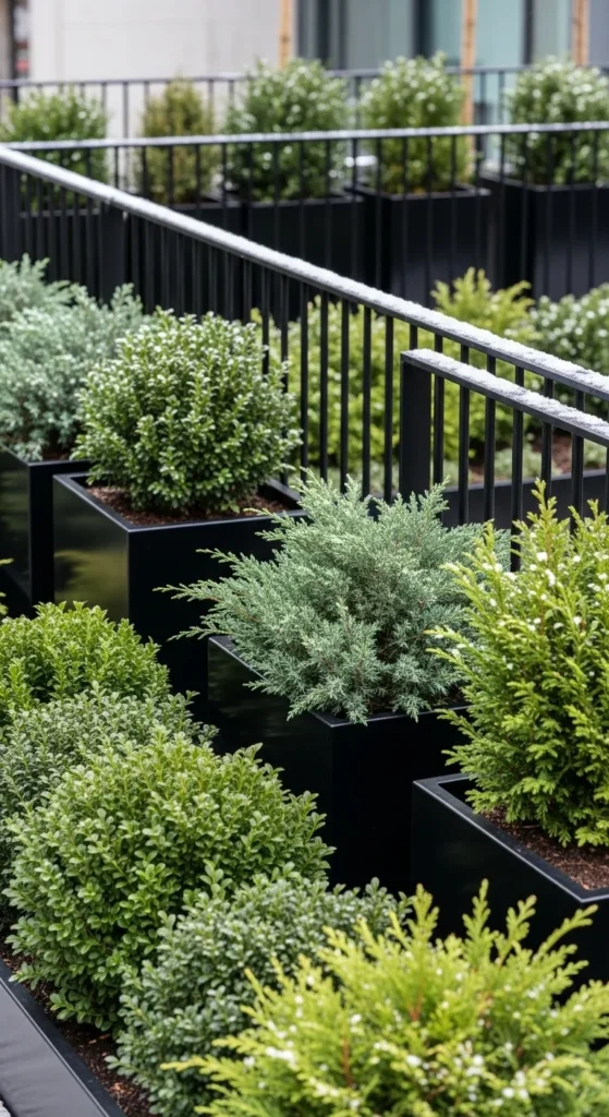 Add hardy evergreen shrubs. The mix creates depth without heavy decoration.