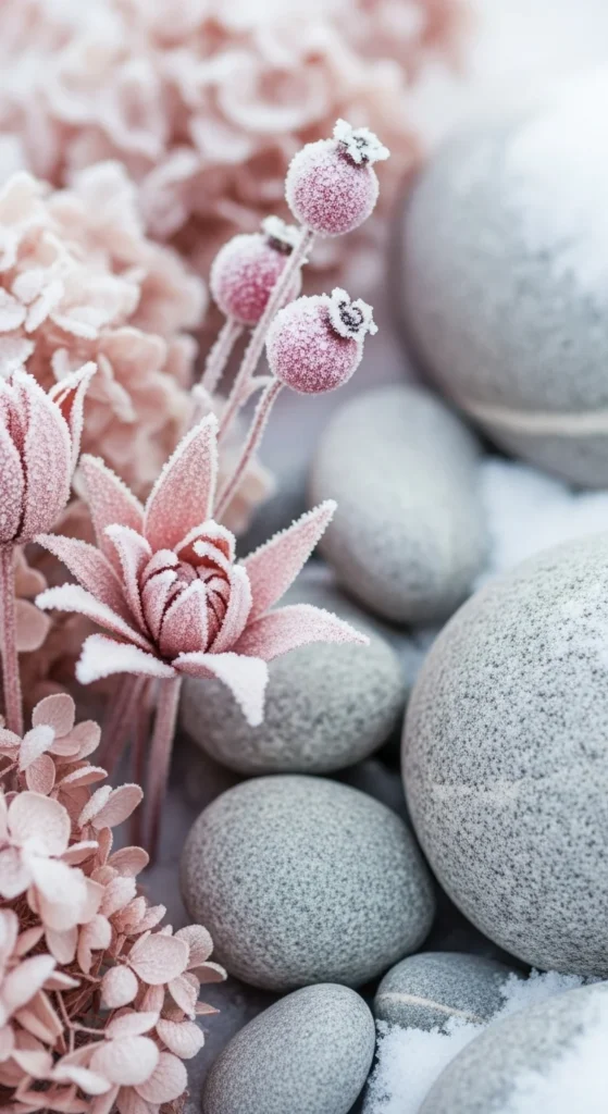 Try frosty blue stones paired with white branches or winter flowers for a bright yet calm look. Blue tones reflect the cold season while whites mimic frost.