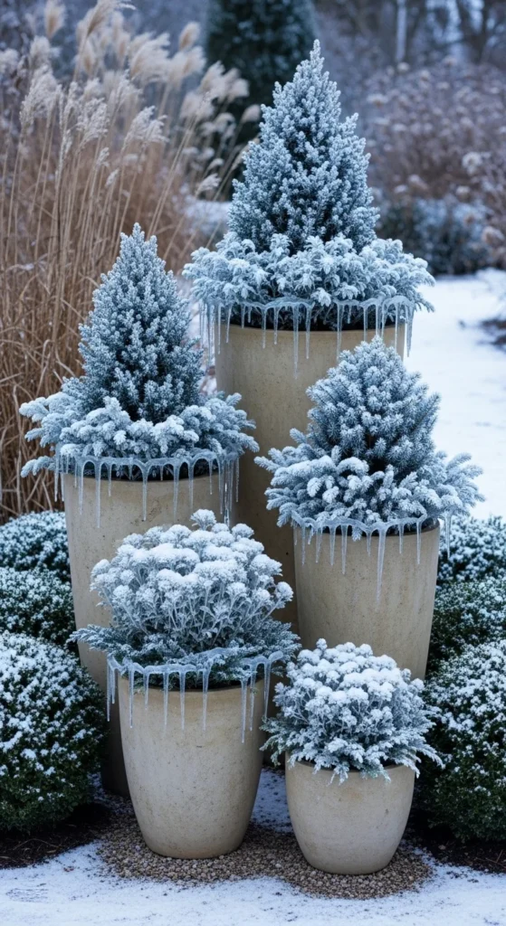 Combine beige planters with blue-tinted foliage for a calming winter palette. Plants like blue fescue or blue spruce work well.
