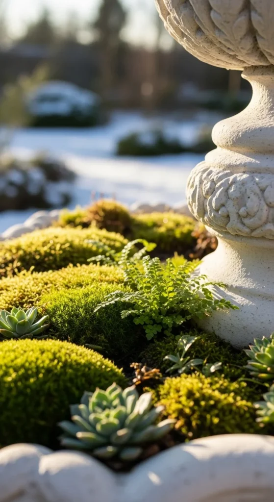 Moss green and stone white sit naturally in winter. Add patches of real or faux moss around stepping stones.