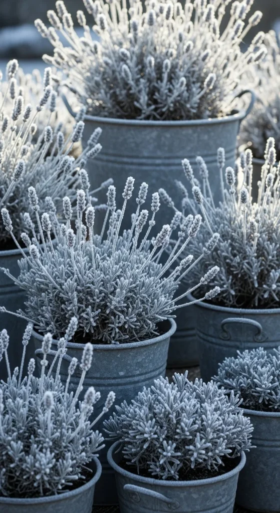 Grey pots or gravel help this shade feel natural during colder months. Add dried lavender bundles around seating spaces for scent and texture.