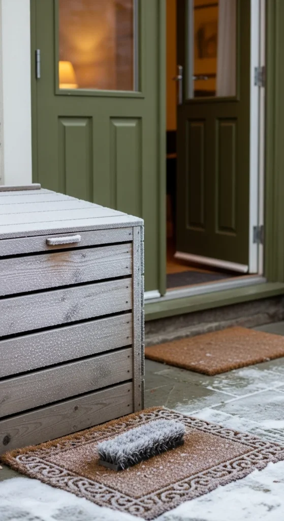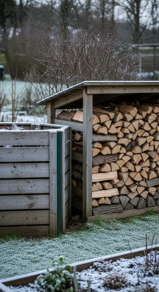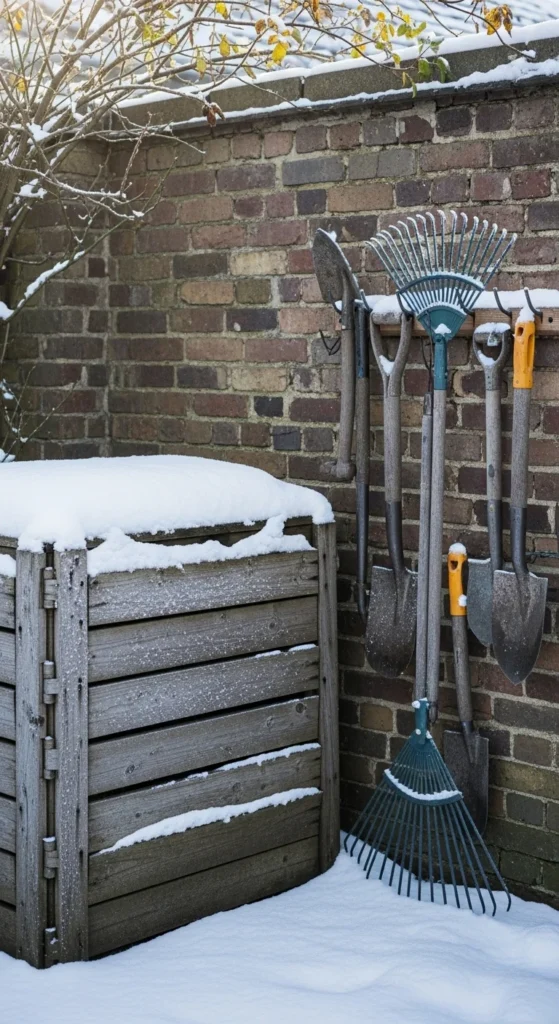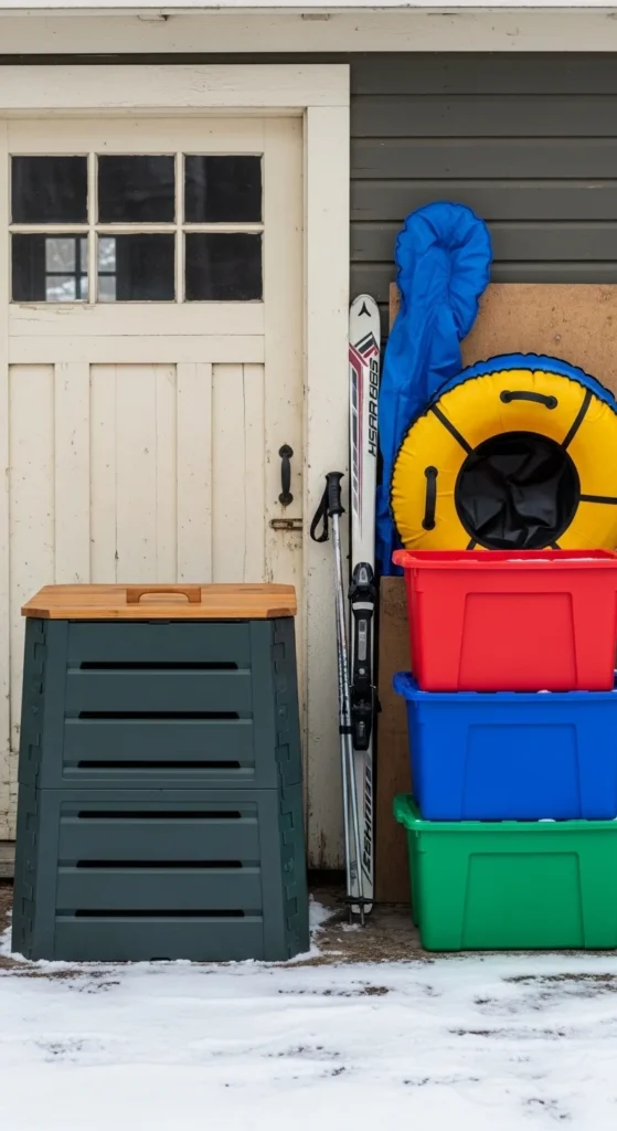 Keeping your compost bin near the tool rack saves trips. You’ll have a fork, rake, and bucket right at hand. This makes winter maintenance smoother. Place the bin on pavers or bricks so snowmelt doesn’t cause sinking. The tool zone already stays tidy, so the bin fits naturally into the space.