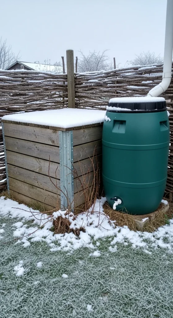 Placing your compost bin beside the rain barrel helps with moisture control. If your compost gets too dry, you can dip into the barrel for a small splash of water. Position the bin on the opposite side of the barrel from the main walkway to keep movement simple. This pairing helps you maintain a balanced compost mixture during cold spells.