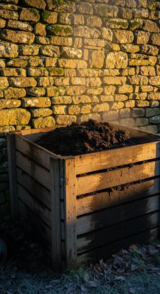 Stone walls absorb and release warmth slowly. Place your compost bin against the sunniest section. The wall helps maintain a slightly warmer pocket, supporting decomposition through winter. Keep the bin a few inches off the wall for airflow. Add straw around the base if you want extra insulation.