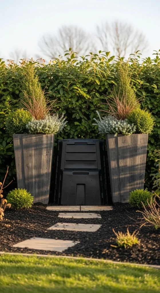 Tall planters can shield your compost bin without adding permanent structures. Place two planters in front of the bin, leaving space to walk behind them. This keeps the bin accessible but visually hidden. Use hardy winter plants like dwarf conifers so the screen stays intact.
