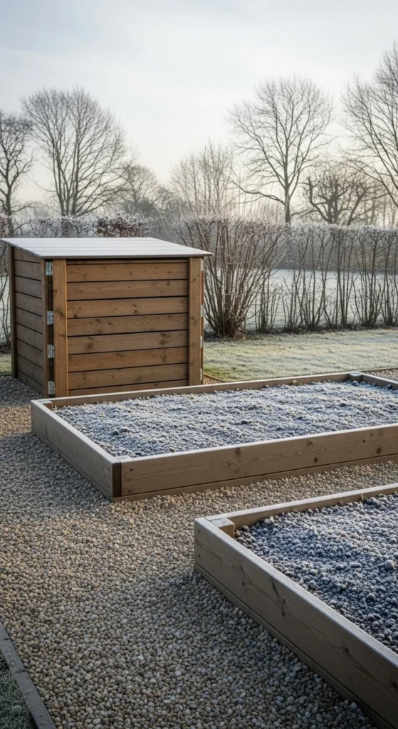 Gravel paths stay firmer than soil paths in winter. Place the compost bin along a gravel walkway so you don’t slip during wet or icy days. Add stone pavers directly in front of the bin for steady footing. Keep a handheld fork there for quick turning. This setup works well for gardens with multiple access routes.