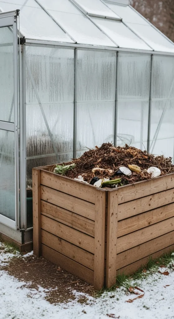A compost bin near the greenhouse keeps plant trimmings and spent soil close by. The warmth from the greenhouse may raise the temperature slightly in that corner, helping the compost break down faster. Lay a walkway of pavers between the greenhouse and the bin so trips stay easy. Keeping everything close by reduces the time spent moving materials through cold air.