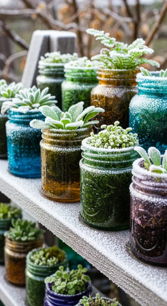 Old jars or bottles make artistic planters for herbs or succulents. Drill drainage holes or layer gravel inside. The reflective glass brightens winter gardens and keeps small plants visible through frost.
