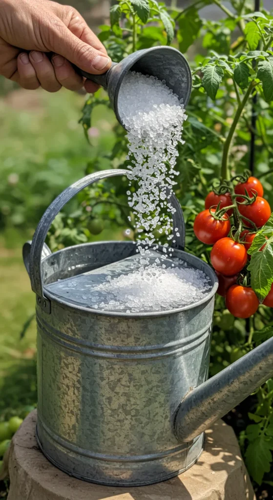 Epsom salt supplies magnesium and sulfur, key for photosynthesis. Dissolve in water and use as a foliar spray for tomatoes, peppers, and roses. It helps with leaf color and flower production.