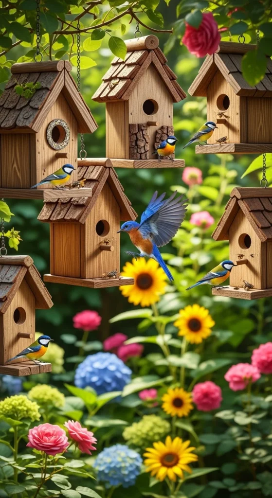 Attract insect-eating birds by adding birdhouses or feeders. Birds target caterpillars, beetles, and aphids naturally. Position near crops but safely away from pets. A few houses can control pests over an entire backyard garden, making it low-cost and environmentally friendly.