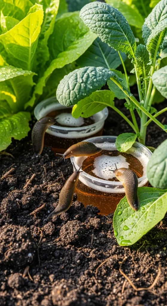 Beer traps lure slugs to a drowning solution. Bury containers at soil level near plants. Refresh beer every few days. Effective and low-cost, repurposing kitchen beer or stale drinks. Works best in damp areas.
