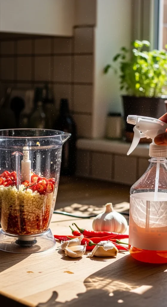 Crush garlic and chilies in a blender with water. Strain and spray on plants to deter aphids, caterpillars, and other soft-bodied pests. Apply weekly, especially after rain. A homemade spray keeps chemicals out and uses pantry staples. Budget tip: use leftover garlic skins and chili scraps from cooking.