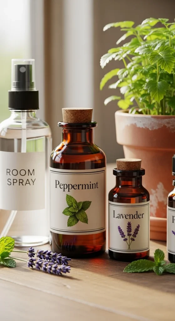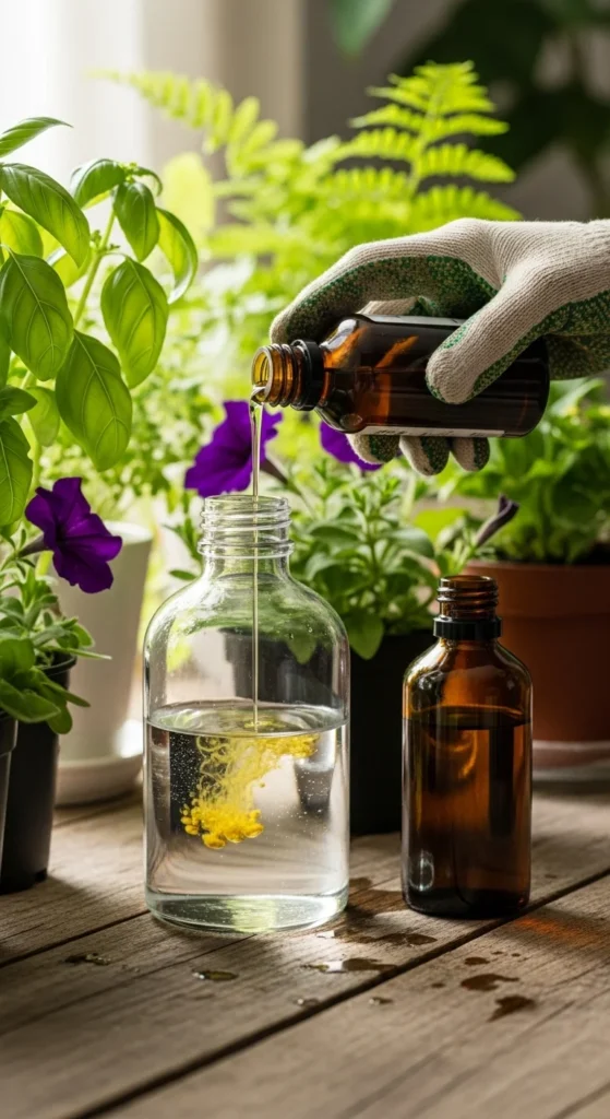 Mix 10 drops of peppermint or lavender essential oil in a cup of water and a teaspoon of dish soap. Spray on windowsills, door frames, or directly on plants. The pleasant scent drives away flies, mosquitoes, and aphids.