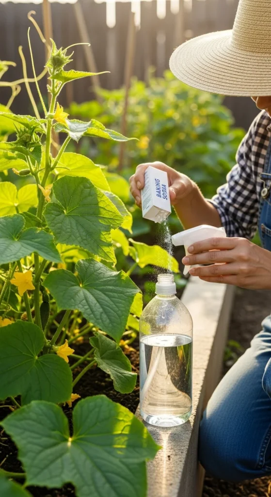 For fungal problems, dissolve one tablespoon of baking soda in a quart of water and spray it on affected leaves. It prevents mildew and fungal spores from spreading. Repeat weekly during humid weather.