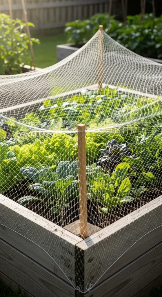 Protect your crops from birds and insects using lightweight mesh or row covers. They let sunlight and air through while blocking pests. Secure the edges with rocks or clips to keep everything snug.