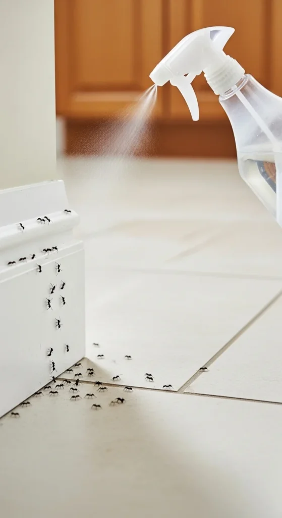 Mix equal parts vinegar and water, then spray it along ant trails, windows, and door frames. Ants hate vinegar’s strong scent and won’t cross the treated area. Wipe surfaces after spraying for a clean finish.