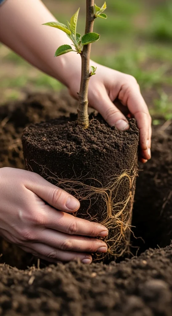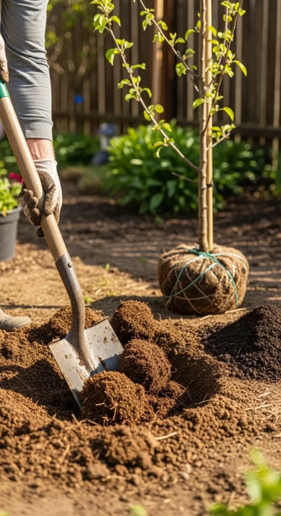 Avoid using too much fertilizer at first — it can shock the young tree. The goal is to give roots loose, rich soil where they can spread easily.