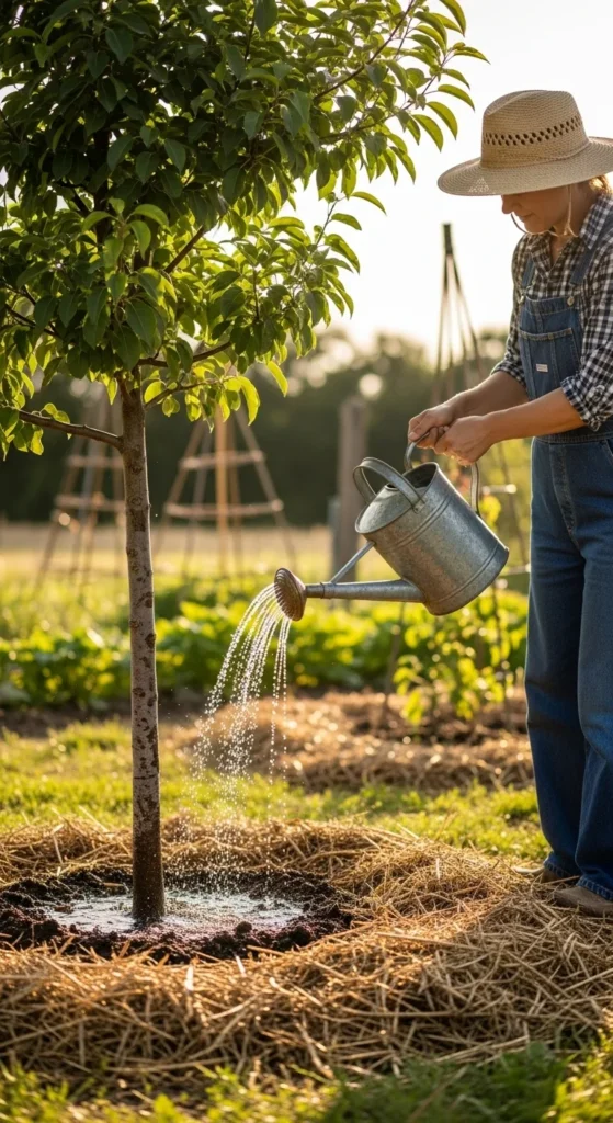 Consistent watering helps young fruit trees establish strong roots. Aim to water once or twice a week, depending on your weather and soil type.