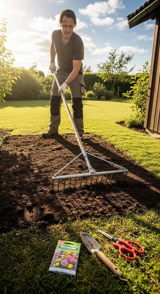 - Clear the area: Remove grass, weeds, and debris so seeds can reach the soil.