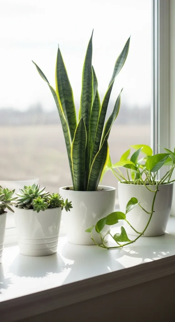 White ceramic pots are timeless. They go with any decor and let your plants be the star. Choose matte or glossy finishes for variety. Try grouping different shapes together for a clean, organized look. These pots are easy to find at discount stores or thrift shops. If you want a cohesive display, paint mismatched pots white using chalk paint. The result looks intentional and classy. Pair with greenery like ferns or trailing pothos for contrast. This setup fits perfectly in Scandinavian or modern interiors and brightens any dull corner.