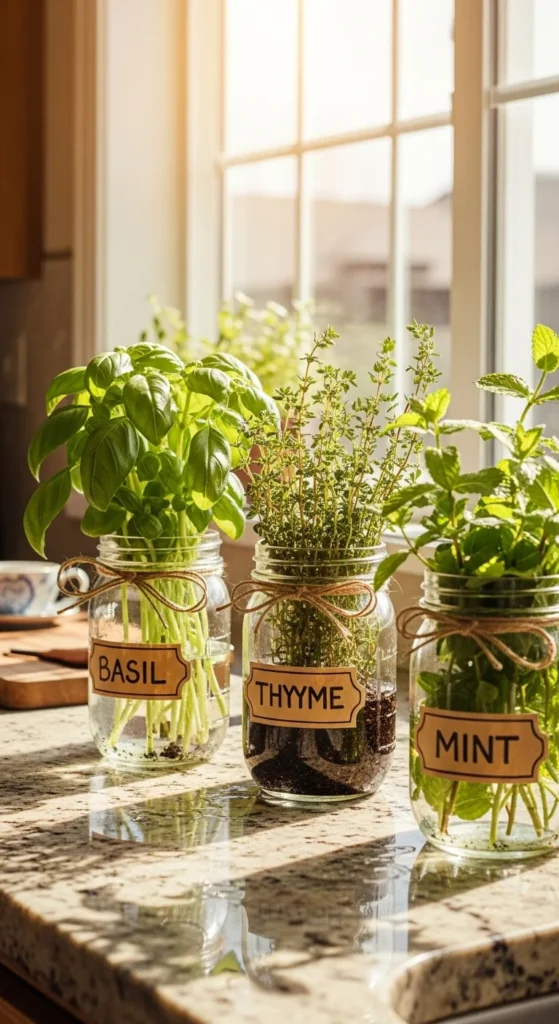 Growing herbs in mason jars adds charm to any kitchen. Drill small holes in the lid or add pebbles for drainage. Fill with potting mix and your favorite herb seeds. Keep them near a sunny spot, and you’ll always have fresh garnishes within reach. Label jars with chalk markers or twine tags for a farmhouse vibe. It’s functional, cute, and totally DIY-friendly.