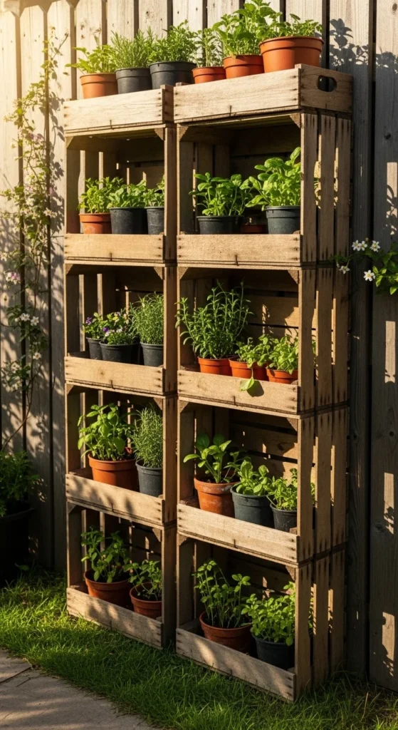 Stack old crates to create a vertical garden. Place small pots inside each one for a rustic yet organized display. Sand and stain the wood for a polished finish, or leave it weathered for character. Perfect for balconies or patios, this setup saves space and adds structure to your garden corner.