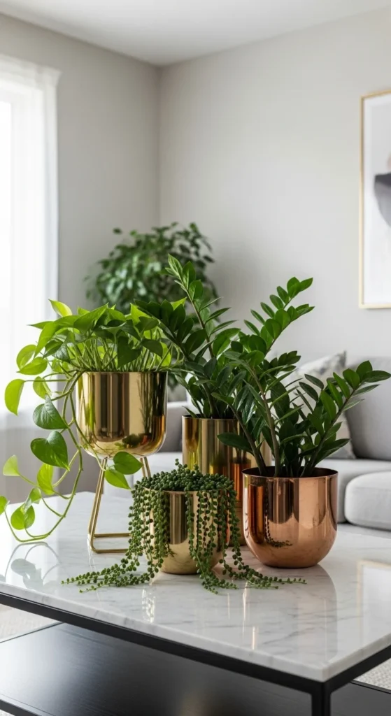 Metallic planters bring instant glam. Gold, copper, or brass tones catch the light beautifully. Pair with lush greens like monstera or peace lilies for contrast. You can spray-paint cheap plastic pots in metallic shades to get the same effect. Add them to coffee tables or shelves for a subtle touch of luxury without the price tag.