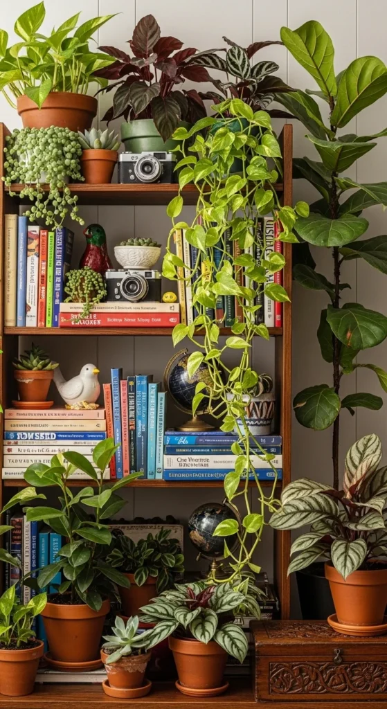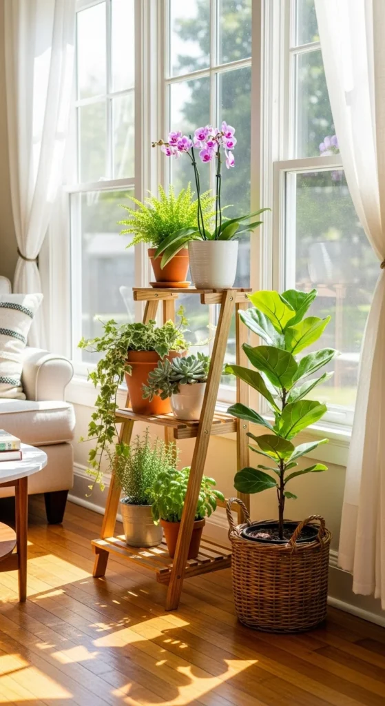 Tiered stands help you display multiple plants without crowding your floor. Choose wood or metal stands that match your decor style. Arrange trailing plants on top tiers and compact ones below. This creates visual flow and easy watering access. It’s also a clever trick for small spaces — you get a mini jungle without losing floor area.